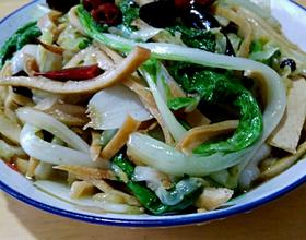 - 9. 然后倒入小白菜和干豆腐,翻炒均匀,盖盖稍微焖一小会,然后加盐,耗油,生抽,翻炒一下,就能出锅了!