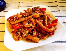这是一款家庭版的不粘锅鱿鱼,味道非常棒,最后撒上芝麻,口感香极了