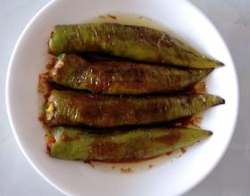 青椒翻面煎至起虎皮后,倒入酱汁,收汁即可
