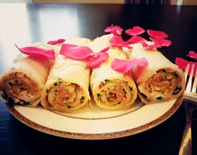 在用铲子搅均匀了,不用反,直接小火慢慢煎,鸡蛋凝固了就可以了。在撒上试量椒盐卷起,中间切开放盘了。