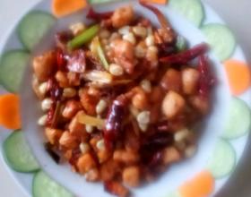 再下入鸡丁炒2分钟后,放入花生,碗欠倒入锅中,灵芝麻油起锅即可。