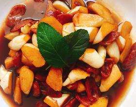 腊肠翻炒10秒就可以放茭白块,适量久了,容易炸干了腊肠,加水能让茭白口感更嫩