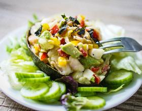 - 9. 混合好的沙拉,装回牛油果得皮里。配上新鲜的生菜叶和小黄吃,味道更清爽
