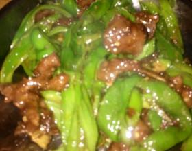 油适量下锅烧热,青椒切条炒半熟,腌制好的刺猬肉下锅继续炒,盐少许,料酒适量,再炒至熟,鸡精少许,生抽适量,起锅