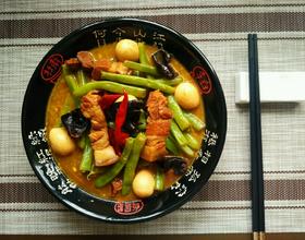 - 12. 挑去香葱,放入四季豆和木耳,中火继续炖。