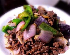 - 7. 锅里底油,加入青椒、生姜片翻炒。