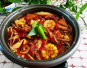 然后下入花椒、火锅底料,豆豉酱、干红辣椒、黄酒、炒出红油