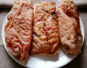 - 6. 把醒好的面 擀成薄皮 切成想要的大小(想吃大的可以擀成大片 因为自己吃 就不在乎形状是否好看了 只要保证薄皮大馅 吃着带劲儿就好)放上馅 卷好 没粘合上的地方可以调点面糊封住 以免下油锅炸的时候露馅