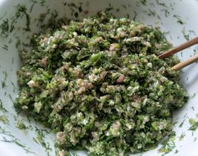 肉和茴香拌匀,加入味精,鸡精,十三香,香油。