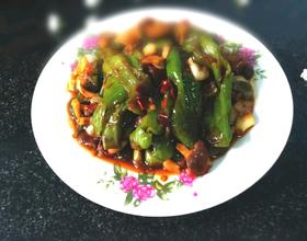 - 6. 锅内留少许的油,下入姜蒜爆香,调入豆瓣酱,料酒,生抽,老抽翻炒均匀,倒入青椒翻炒片刻入味后即可(此步骤忘拍了)
