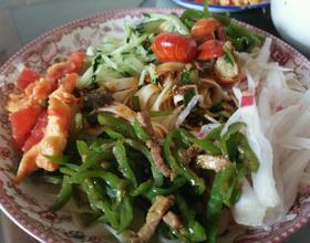 我今天配了西红柿炒蛋、辣椒丝炒肉、爆炒虾尾、黄瓜丝萝卜丝、既有西红柿的酸、有黄瓜的清凉干脆、也有红萝卜丝的甜辣、更有辣椒丝和虾尾的鲜辣,好期待!