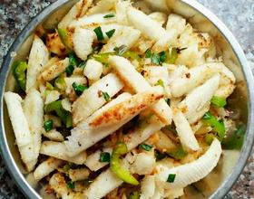 馒头切条,青椒切丝。我用的是微辣的青椒。