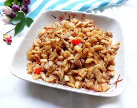 清洗干净、五花肉切丁、用生粉、酱油、盐、腌制10分钟、指天椒切粒、姜去皮切粗丝、蒜去衣切片