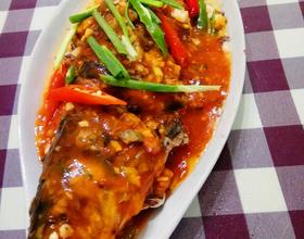 汁水煮好淋在鱼身上,放上葱段红青椒装饰,开吃