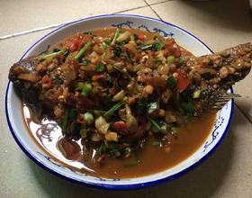 小火加入姜蒜爆一下,加水适量,不要太多,差不多盖过鱼一半的样子,加入醋少许,野山椒,剁辣椒,指天椒,豆酱,蕃茄粒,葱头,香菜头,老抽少许