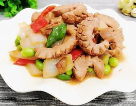 锅中倒油,倒入洋葱,青红椒片,毛豆米煸炒断生。