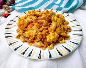 热锅放油、倒入搅拌好的红葱头鸡蛋液、煎熟