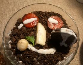 把弄好的粉末撒在酸上面,也可以撒一层,在弄一层酸奶然后在撒一层奥利奥粉末,看个人喜欢,然后就可以装饰了,装饰完,在倒点酸奶在水果表面上,就ok了,完成