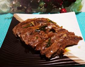 然后把切好的牛肉条,放入锅里,再把准备好的生抽,老抽,蚝油和鸡汤放入锅内大火熬开,转小火后翻一面,待汤汁快要浓稠时,给一点水淀粉让汤汁浓稠,加一点香油就OK了