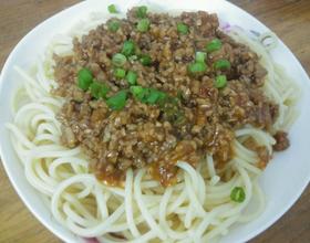 - 8. 最后意面煮好捞出过凉开水,装盘,淋上做好的肉酱汁,再撒上点葱花就可以了