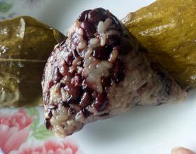 糯米红豆,血糯米滤干水分,叫糖拌一起,取两张叶子折个角,放一点米中间放个蜜枣再放一层米上面放个红枣