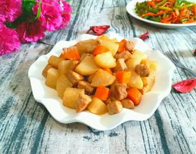 - 6. 放入白萝卜块、胡萝卜丁,翻炒。