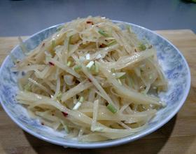 把沥干水的土豆丝放入碗里,在将佐料依依放进拌匀,装盘即可