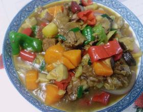 锅里加食用油炒香葱姜蒜,下入主料加水600克,小火炖20分钟,放入青红椒香菇。