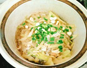 净锅,热锅放油,倒入姜粒爆至微黄,然后倒入海米,炒至香味出,放入蒜粒,肉丝,最后加入节瓜丝翻炒一会,加入泡海米的水,再加一点清水,看材料多少一般是水刚漫过材料就可,稍煮2一3分钟后加入粉丝,翻炒。