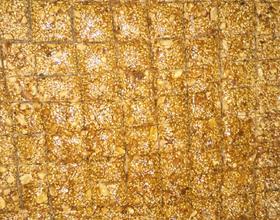 - 10. 倒入拌好的核桃芝麻,迅速地搅拌均匀,使糖浆均匀地裹住核桃芝麻,然后倒入洗干净的砧板上。