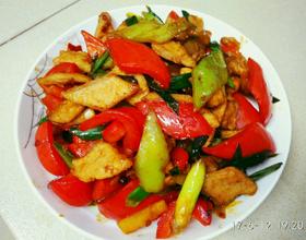 最后把青红椒,蒜苗放入,加入耗油,生抽,一点点盐,鸡精大火翻炒,待蒜苗断生起锅