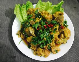 最后加上指天椒和香菜一起倒到沙姜上,生菜做摆盘,味道一级棒