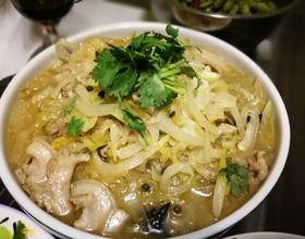- 3. 第三步放入切好的白肉慢炖10-15分钟,看汤色变白后放入粉丝,适量的白醋,这倒正宗的酸菜粉丝白肉就大功告成了,出锅撒上香菜即可。