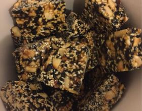 花生炒熟捣碎加白黑芝麻,冰糖溶化一般油加冰糖高温就可以融化,倒入混合芝麻花生核桃搅匀