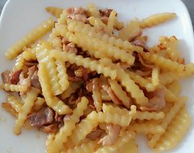 - 6. 炒到七成熟撇到锅一边。把土豆放进去