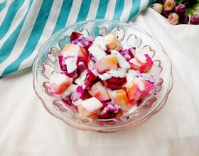 把白蜜瓜、火龙果、错乱放入盘中、淋上酸奶即可