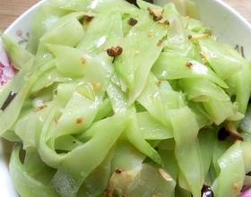油烧热下姜蒜,干辣椒,花椒粒,姜香味爆出,下莴苣,炒两下放盐翻匀