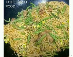 把蒸好的面条道路刚刚煸炒生煎肉的锅里