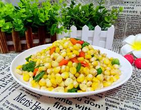 放入玉米粒翻炒均匀。玉米粒变色熟后放适量盐鸡精调好味即可。