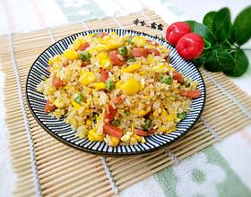 准备好食材,1碗米饭,2个鸡蛋,葱切碎,火腿肠切小粒