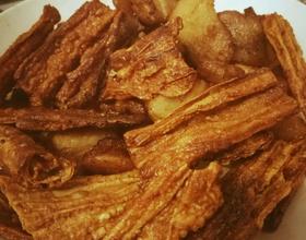炒至金黄色,喜欢比较肥腻的朋友可以,不用像我这样炒的这么干。滤油出锅。