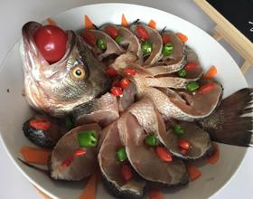 腌好鱼摆造型!就是吧每片摊开,然后上面放小米椒、枸杞、胡萝卜片点缀、鱼嘴放个圣女果!完美孔雀造型就出来了