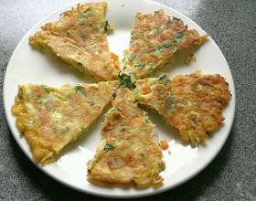 等蔬菜饼一面微黄时 ,翻个面接着中火煎