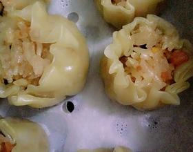 - 4. 如下图,拿一张饺子皮,中间放入馅,往上收口,然后放蒸屉里大火蒸30分钟。