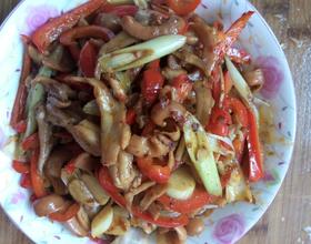 油锅烧热,下姜蒜爆香,下鱿鱼丝,炒两下,放豆瓣酱炒香,一分钟后放红椒炒匀,再放大葱,调味即可