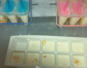 混合在一起后,牛奶芒果逐个放入盛雪糕的容器里