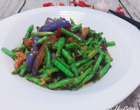 倒入控过油的茄子豆角,翻炒均匀,然后加盐、糖、蒸鱼豉油、生抽、蚝油