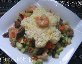 最后倒入黄瓜粒、豌豆粒、胡萝卜粒、香菇粒、虾球和鸡肉粒,加盐和胡椒粉翻炒几下盛出。