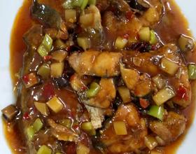 - 4. 锅中少许底油,炒干辣椒葱姜蒜爆锅,肥肉入锅炒几下,加入竹笋丁香菇丁榨菜丁,翻炒。料酒,醋,少许酱油,辣椒酱,高汤,鱼块入锅后加味精白糖,煨一下,汤少了,把鱼盛出,装盘,,然后,青椒丁加入汤中收汁,加红辣椒油后,浇到鱼表面。