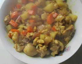 鸡腿切丁用热水捞下洗好沥水 放油锅炒好备用